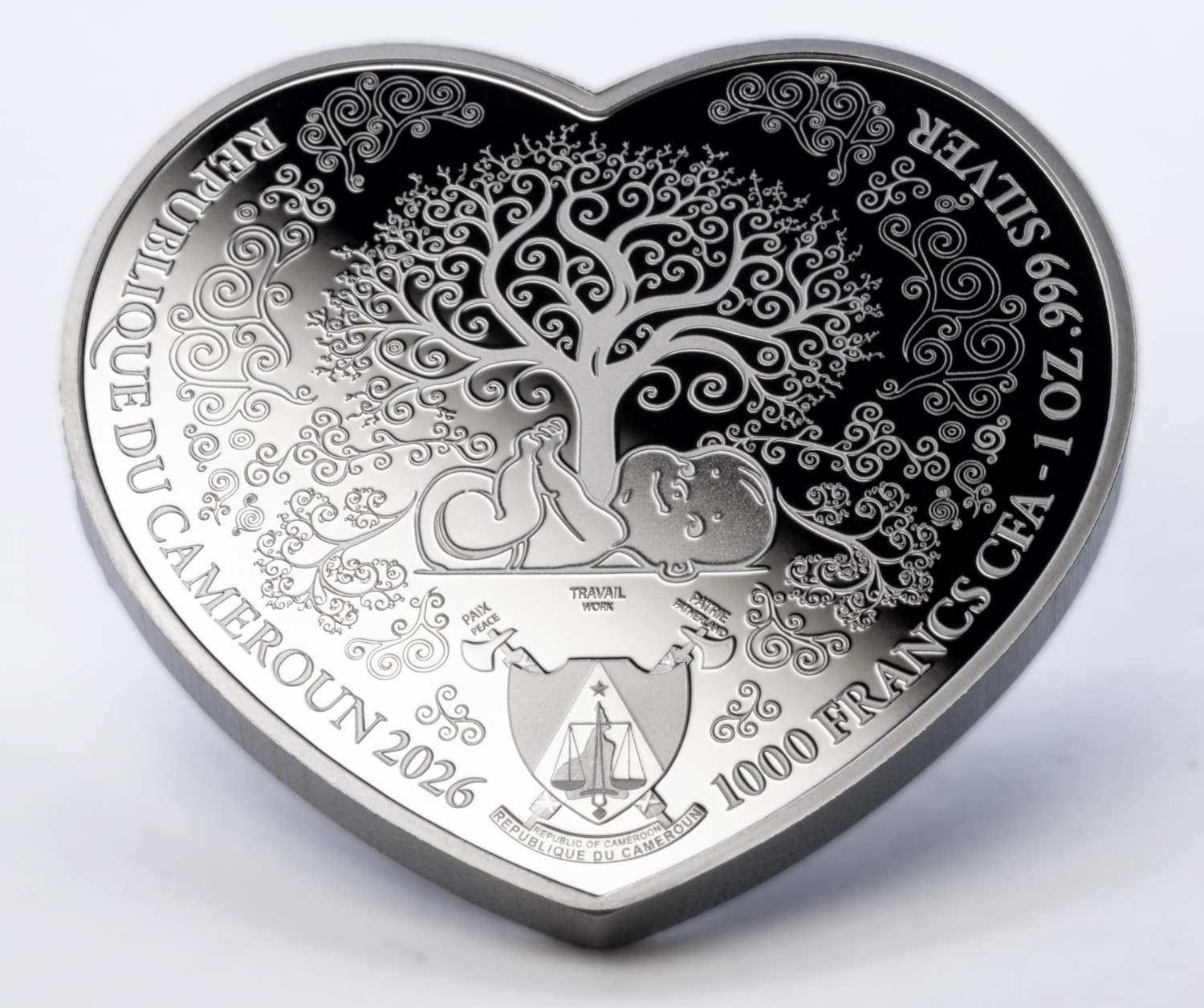 The obverse features the Coat of Arms of the Republic of Cameroon beneath a stylized Tree of Life, its elegant branches spreading across the heart-shaped design. A peacefully sleeping baby rests within the roots of the tree, symbolizing new life, family, and growth. The design is divided into proof and matte finishes, highlighting the intricate ornamental patterns and the coat of arms with inscriptions “REPUBLIQUE DU CAMEROON” (the issuing country), “2025” (the year of issue), and “1000 FRANCS CFA” (the face value).